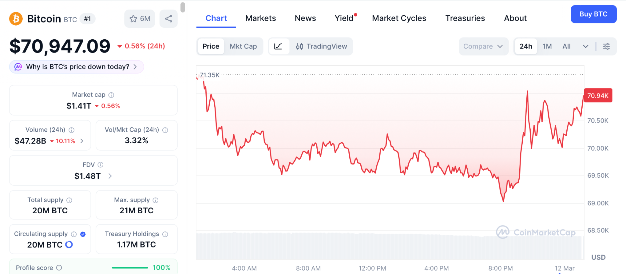 BTC handelt laut CoinMarketCap bei rund 70.947 US-Dollar, mit 1,56 Milliarden US-Dollar an ETF-Zuflüssen im März, die anhaltende institutionelle Nachfrage signalisieren, trotz eines Fear Index von 12. CryptoQuants Bull Score liegt bei 10 von 100.