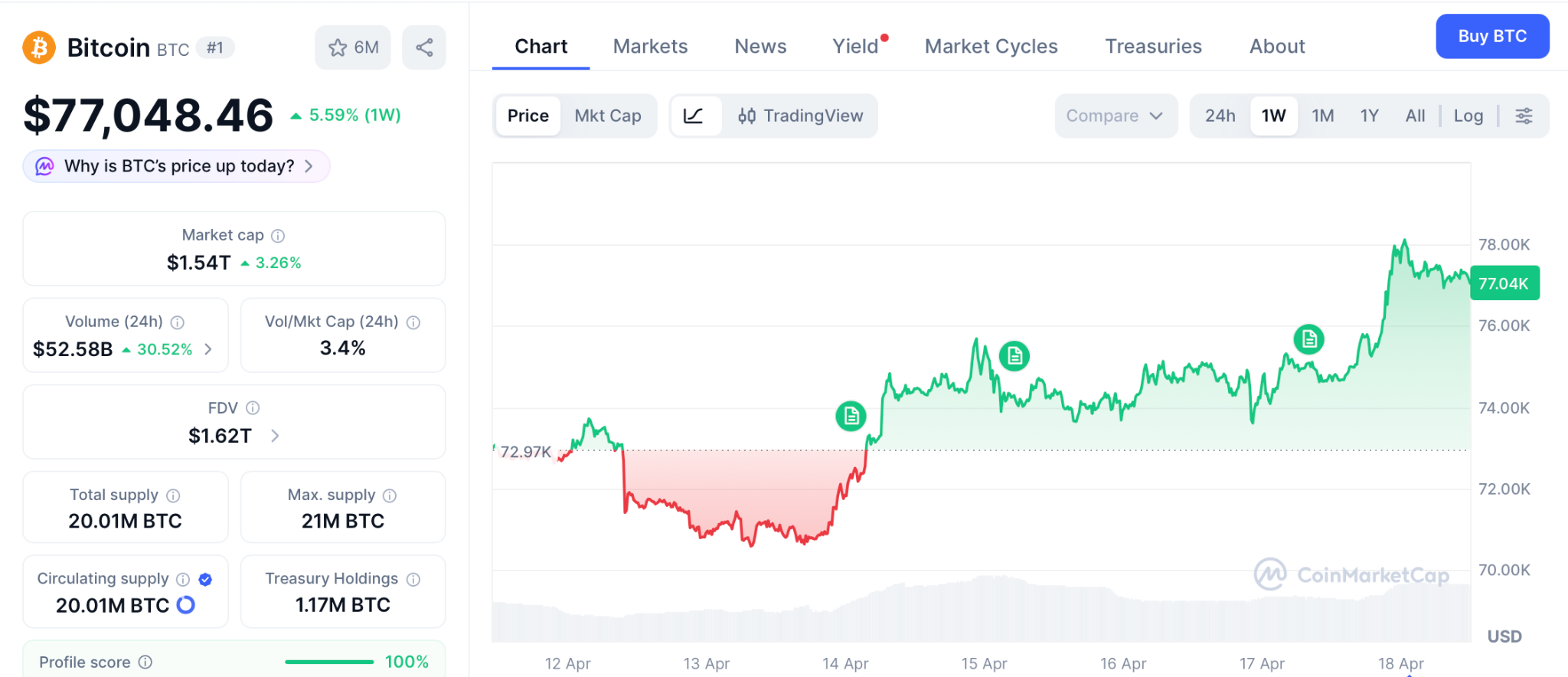 Bitcoin notiert bei rund 77.048 US-Dollar pro CoinMarketCap, nachdem es nach den Hormus-Nachrichten um 5,59 % stieg und über 78.000 US-Dollar ging, wodurch der größte Teil des Rückgangs vom Oktober-Höchststand von 126.198 US-Dollar wieder aufgeholt wurde. Morgan Stanley’s MSBT erweitert den Zugang für institutionelle Anleger neben den Produkten von BlackRock und Fidelity, die zusammen über 53 Milliarden US-Dollar halten.