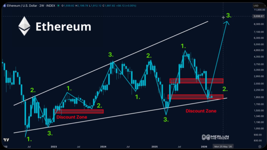 In diesem Sinne glaubt der berühmte Analyst Merlijn The Trader, dass Ethereum nun in eine Rabattzone eingetreten ist, was auf eine bullische Ethereum-Preisprognose hindeutet. Seiner Meinung nach löste ein ähnliches Chartmuster die 4-fache Rallye im Jahr 2023 aus. Wenn sich eine ähnliche Rallye wiederholt, prognostiziert Merlijn, dass Ether laut seiner Ethereum-Prognose 2026 9.500 US-Dollar erreichen könnte.