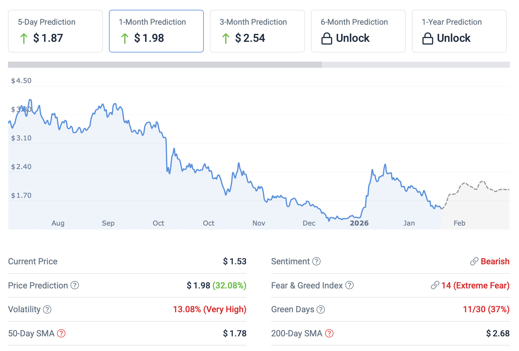 Render rutscht ohne großen Halt weiter. Jetzt liegt es um 1,8 % niedriger, bei etwa [fehlender Wert], und hat einen wöchentlichen Rückgang von 21 % verlängert – das hat es deutlich unter den wichtigsten gleitenden Durchschnitten belassen (Stand 5. Februar). Einige Analysten bezeichnen dies als Akkumulationszone, aber die Kursentwicklung deutet stattdessen darauf hin, dass Verkäufer die Kontrolle behalten.