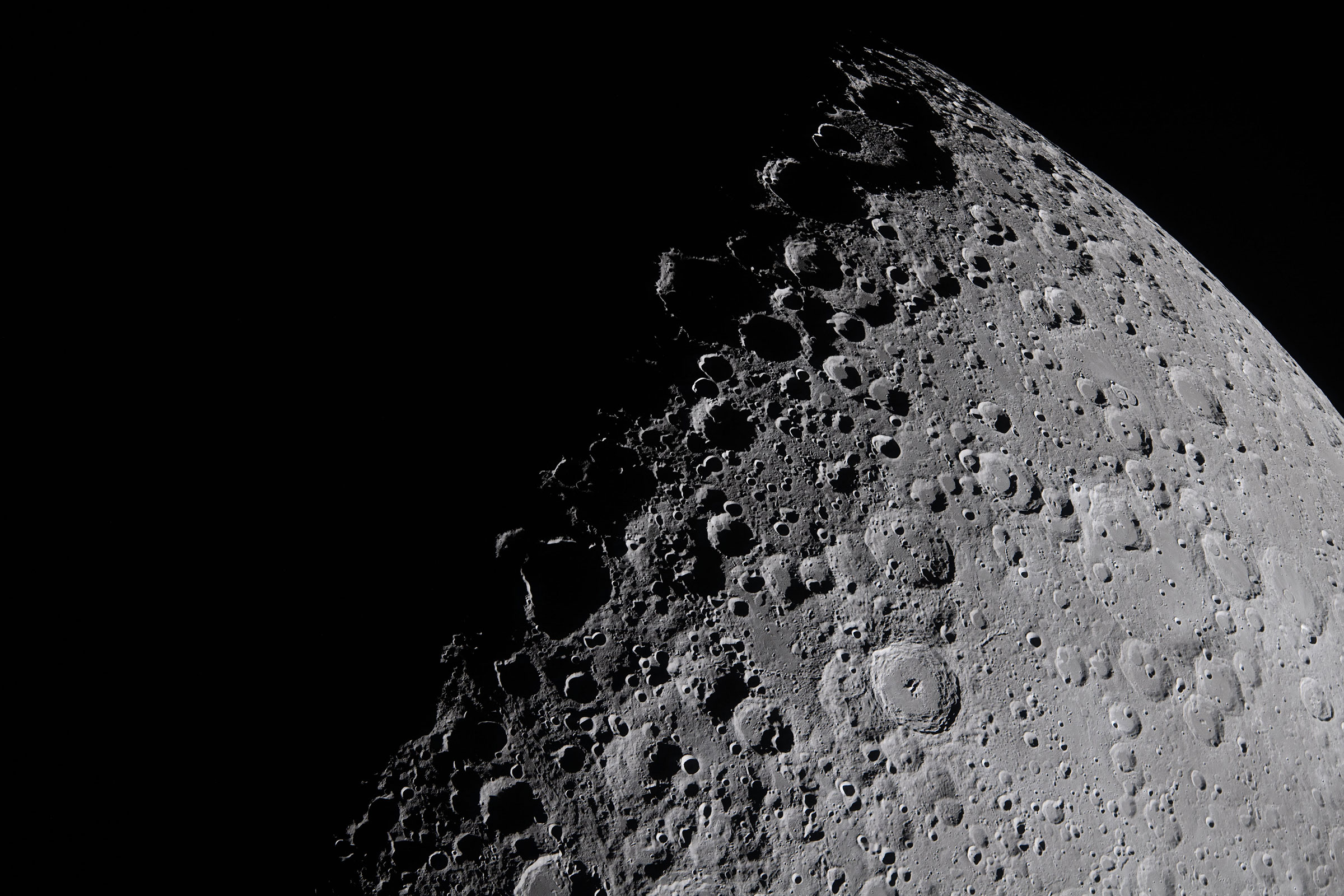 Drei Stunden nach Beginn ihres Schwungs um die Rückseite des Mondes fing die Besatzung dieses eindrucksvolle, steilwinklige Bild ein. Die Terminatorlinie – die Grenze zwischen der hellen und der dunklen Seite des Mondes – ist oben links sichtbar. Der steile Einfallswinkel der Sonne wirft lange, scharfe Schatten, die das zerklüftete Mondgelände plastisch hervortreten lassen. Schatten dieser Art halfen den Apollo-Besatzungen, die Landschaft beim Abstieg zu lesen.